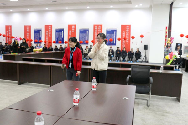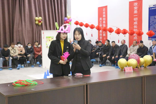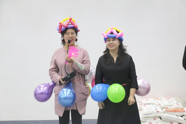 還有我們充滿趣味性的雙人背靠背夾氣球互動游戲,兩位美女主持人熱情洋溢,朝氣蓬勃,得到了員工一致性好評。