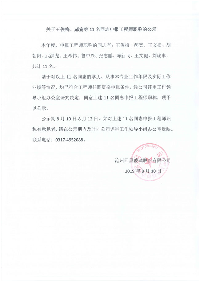 關于王俊梅、郝寬等11名同志申報工程師職稱的公示
